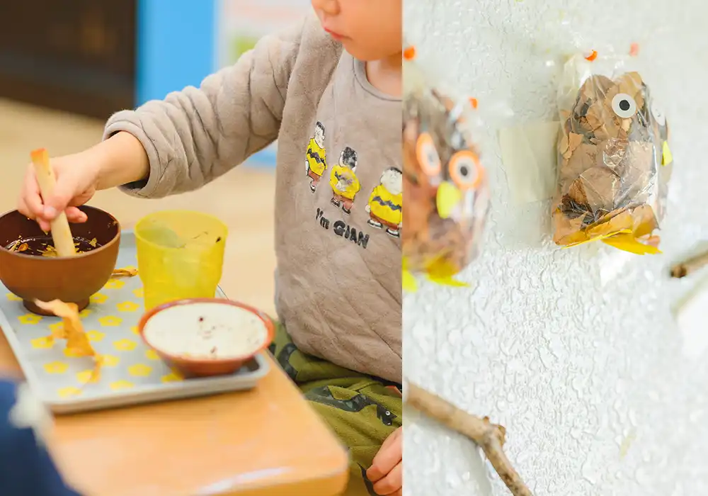 紙や落ち葉など身近にあるものを使って保育士とともに工作をします。